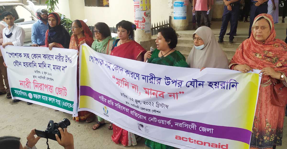 অপরদিকে, রেলওয়ে স্টেশনে মানববন্ধন করা প্রগতিশীল নারীদের দাবি, বিশ্ববিদ্যালয় পড়ুয়া তরুণীকে পোশাকের জন্য হেনস্তা করা অপরাধ। গ্রেপ্তার দুইজনকে সর্বোচ্চ শাস্তি দিতে হবে এবং বাকিদেরও গ্রেপ্তার করতে হবে। এই মানববন্ধনে ঢাকা এবং নরসিংদীর বিভিন্ন সংগঠনের অন্তত ৫০ জন নারী উপস্থিত ছিলেন।