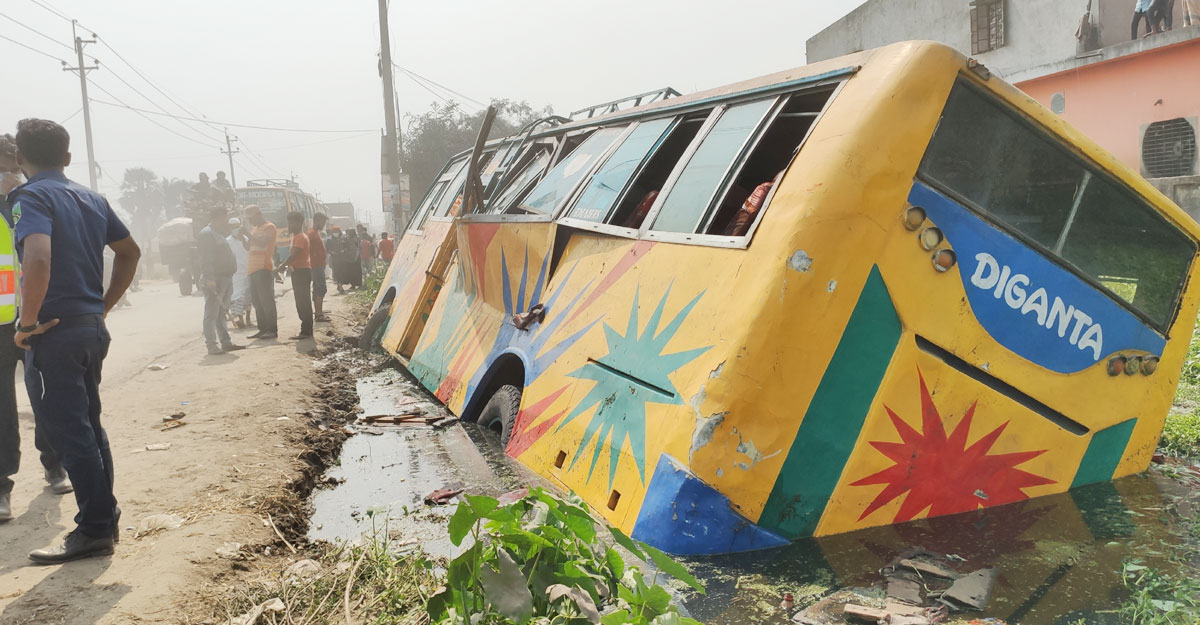 ওভারটেক করতে গিয়ে ডোবায় বাস, আহত ১৫