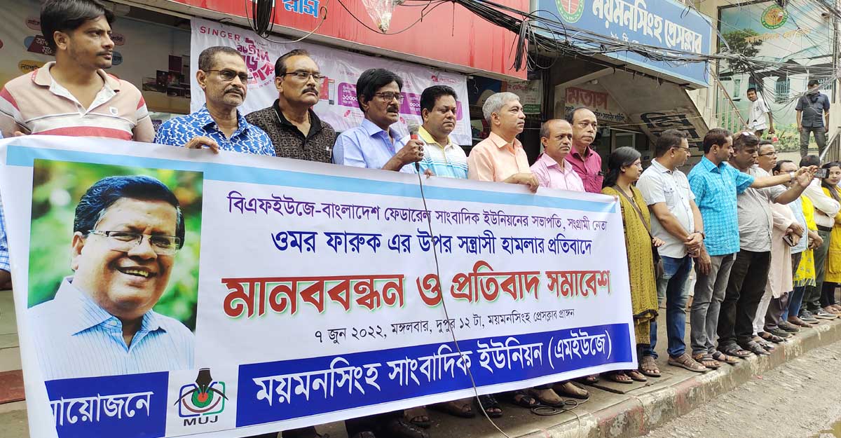 বিএফইউজে- বাংলাদেশ ফেডারেল সাংবাদিক ইউনিয়নের সভাপতি ওমর ফারুকের ওপর সন্ত্রাসী হামলার প্রতিবাদে মানববন্ধন ও সমাবেশ করেছে ময়মনসিংহ সাংবাদিক ইউনিয়ন (এমইউজে)। মঙ্গলবার (৭ জুন) দুপুরে ময়মনসিংহ প্রেসক্লাবের সামনে ঘণ্টাব্যাপী মানববন্ধন কর্মসূচিতে হামলাকারিদের গ্রেপ্তার ও দৃষ্টান্তমূলক শাস্তির দাবি জানানো হয় ।