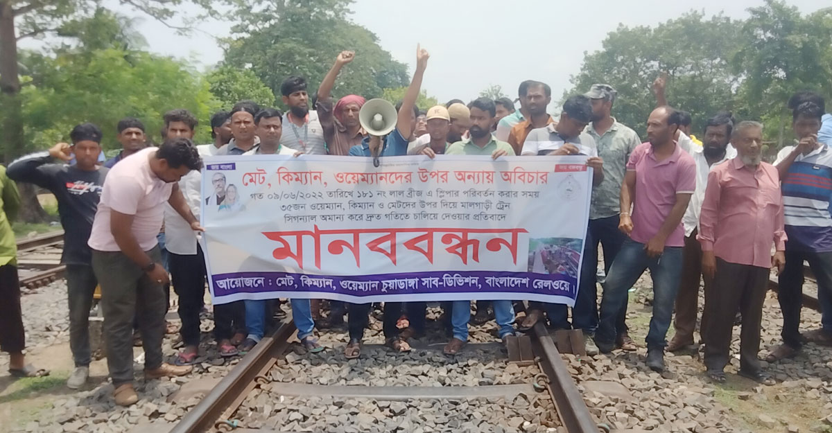 মানববন্ধনে শ্রমিক হুমায়ুন কবির বলেন, লাল ব্রিজের ওপর ২৫-৩০ জন শ্রমিক মেরামত কাজ করার আগে স্টেশন মাস্টারকে আমরা মেসেজও দিয়ে রেখেছিলাম। আমাদের নিরাপত্তার জন্য ব্রিজ থেকে প্রায় ৪০০ মিটার দূরে লাল পতাকা তুলে রাখেন রেল শ্রমিকেরা। বিকেল ৩টার দিকে দর্শনা স্টেশন থেকে ছেড়ে আসা সিরাজগঞ্জগামী পাথরবোঝাই একটি মালবাহী ট্রেন পতাকা ভেঙে লাল ব্রিজে প্রবেশ করে। এ সময় প্রাণ রক্ষায় ব্রিজ থেকে শ্রমিকরা লাফ দেন। কেউ কেউ ব্রিজের রড ধরে ঝুলে পড়েন। ব্রিজের ওপর শ্রমিকদের চিৎকারে ও সামনে রেললাইন সংস্কারের ট্রলি দেখে ট্রেনটি থামিয়ে দেন চালক। আহত হন কয়েকজন শ্রমিক। এরপরও আমাদের ঊর্ধ্বতন কর্মকর্তারা আশ্বাস দেন তোমরা কাজ চালিয়ে যাও। তোমাদের কোনো সমস্যা হবে না। কিন্তু রাত ২টার পর আমাদের ৫ শ্রমিককে কেন বরখাস্ত করা হলো? এর বিচার চাই।