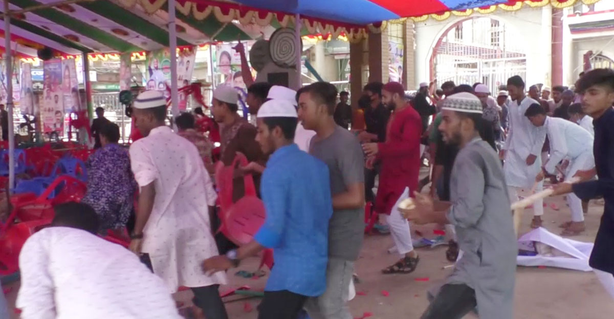 শহরের কেন্দ্রীয় জামে মসজিদ থেকে বের হওয়া মিছিলটি কাচারী বাজার মসজিদের সামনে এসে সমাবেশ করে। সমাবেশস্থলের পাশেই শহীদ মিনার চত্বরে পূর্ব নির্ধারিত পৌর আওয়ামী লীগের সম্মেলন মঞ্চ থেকে মাইকের উচ্চ আওয়াজ আসে। এ সময় কিছু মিছিলকারী উত্তেজিত হয়ে মাইক বন্ধের দাবি জানান। একপর্যায়ে তারা মঞ্চে হামলা চালিয়ে মাইক, চেয়ার, টেবিল ও ব্যানার-ফেস্টুন ভাঙচুর করেন।