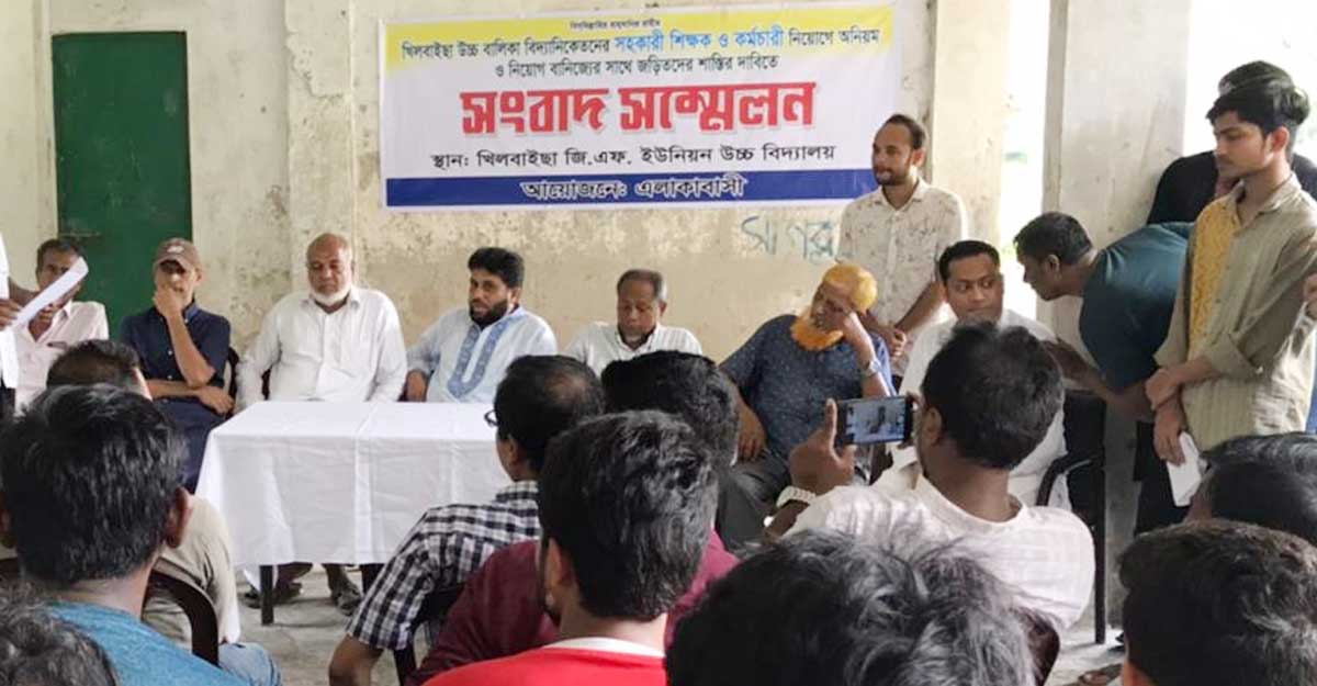 সোমবার (১৩ জুন) দুপুরে খিলবাইছা জিএফ ইউনিয়ন স্কুল অ্যান্ড কলেজ প্রাঙ্গণে এলাকাবাসীর উদ্যোগে আয়োজিত সংবাদ সম্মেলনে এসব অভিযোগ করা হয়। এ নিয়োগ বাতিল ও অনিয়মে জড়িতদের শাস্তির দাবি জানিয়েছেন এলাকাবাসী।
