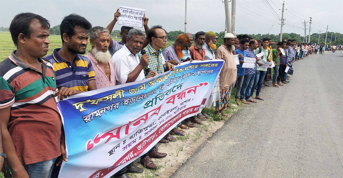 যশোর শহরতলির বিল হরিনার রামনগর ইউনিয়নের অংশে প্রস্তাবিত বিসিক-২-এর জমি অধিগ্রহণপ্রক্রিয়ার প্রতিবাদে এককাট্টা হয়েছেন গ্রামের বাসিন্দারা। তিন ফসল বোরো, আউশ, আমনের ক্ষতি থেকে বাঁচতে তারা সড়কে মানববন্ধন করেন।
