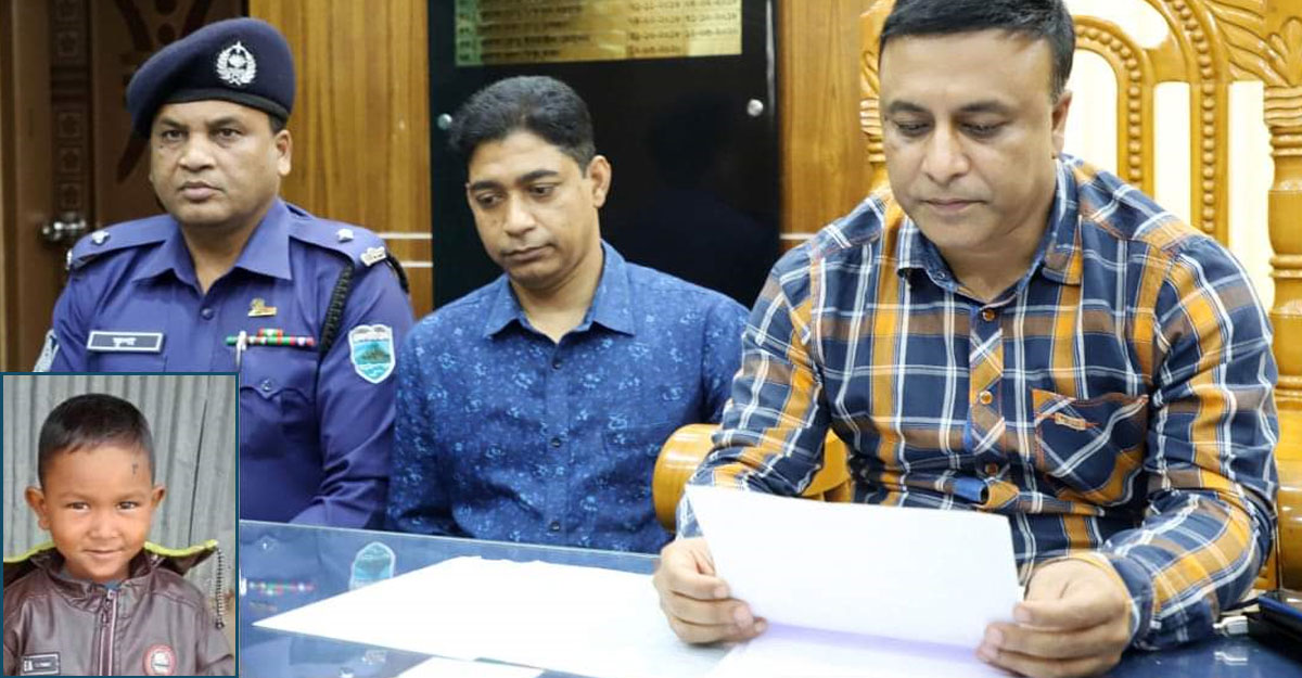 প্রেস ব্রিফিংয়ে বগুড়ার পুলিশ সুপার আলী আশরাফ ভূঞা, ইনসেটে নিহত শিশু তাওহীদ