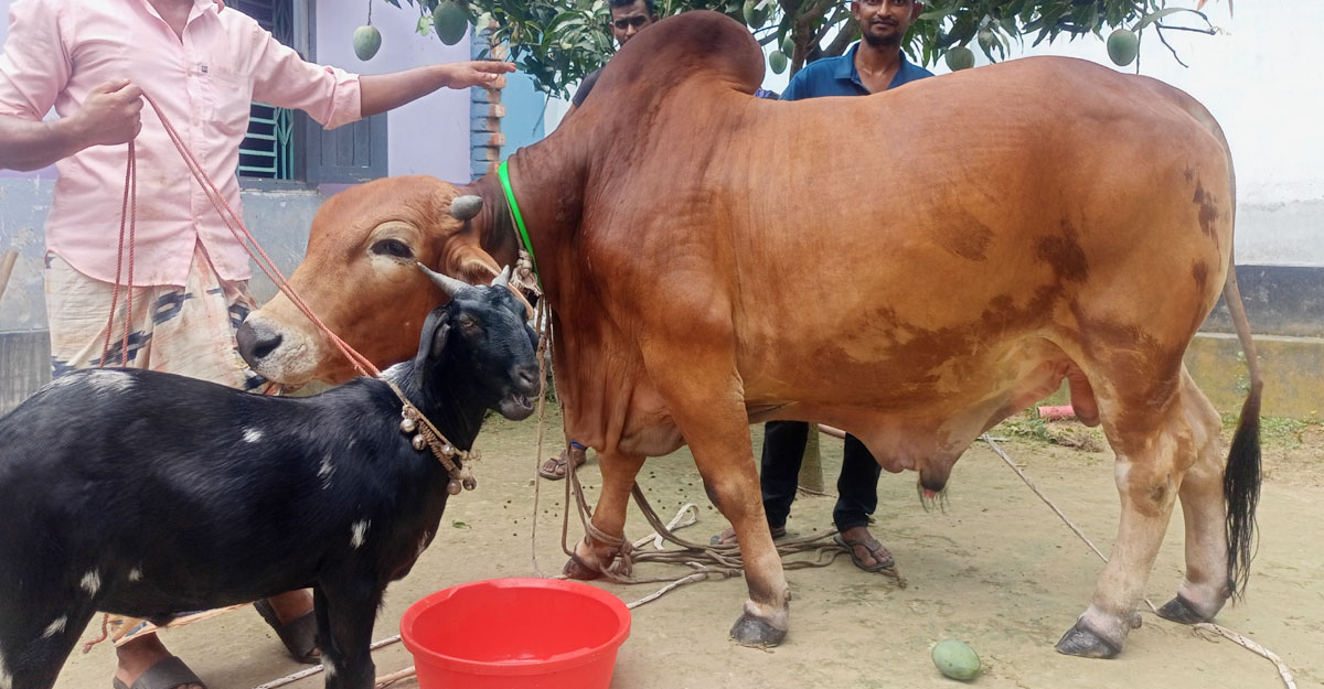 দিনাজপুরের ঘোড়াঘাটে ডন-বাদশা-টাইগার নামে তিনটি গরু কিনলে ক্রেতাকে একটি খাসি উপহার দেওয়া হবে বলে ঘোষণা দিয়েছেন খামারি মনিরুল ইসলাম।