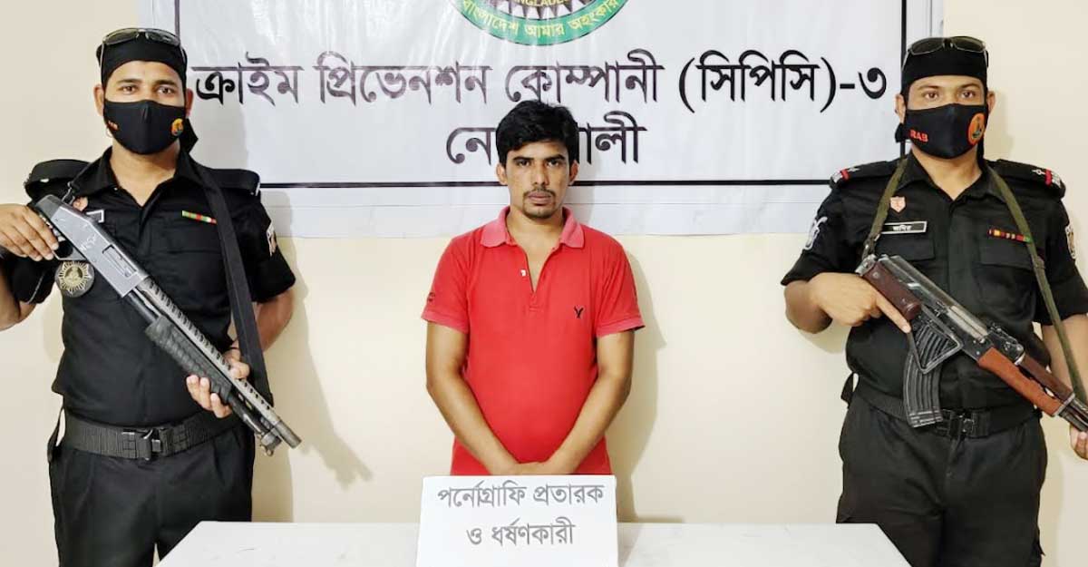 নোয়াখালীতে ৪ বছরের শিশুর গলায় ছুরি ধরে হত্যার ভয় দেখিয়ে এক গৃহবধূকে (২৬) ধর্ষণ ও অশ্লীল ভিডিও ধারণ করার মামলায় মো. কালাম ওরফে কালা মিয়া (৩০) নামে এক যুবককে গ্রেপ্তার করেছে র্যাপিড অ্যাকশন ব্যাটালিয়ন (র্যাব)-১১ এর সদস্যরা। মঙ্গলবার (৫ জুলাই) রাতে সদর উপজেলার সোনাপুর জিরো পয়েন্ট সংলগ্ন আল আকসা রেস্তোরাঁর সামনে থেকে তাকে গ্রেপ্তার করে র্যাব।