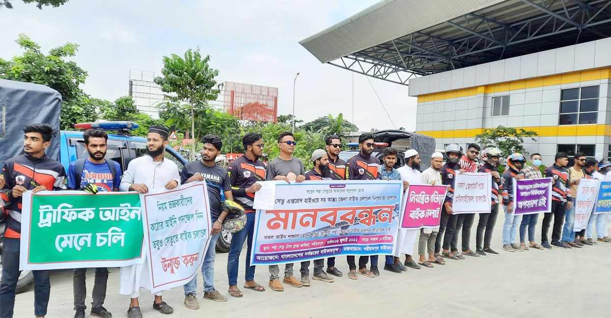 পদ্মা সেতুর জাজিরা প্রান্তের টোল প্লাজায় বাইকারদের মানববন্ধন