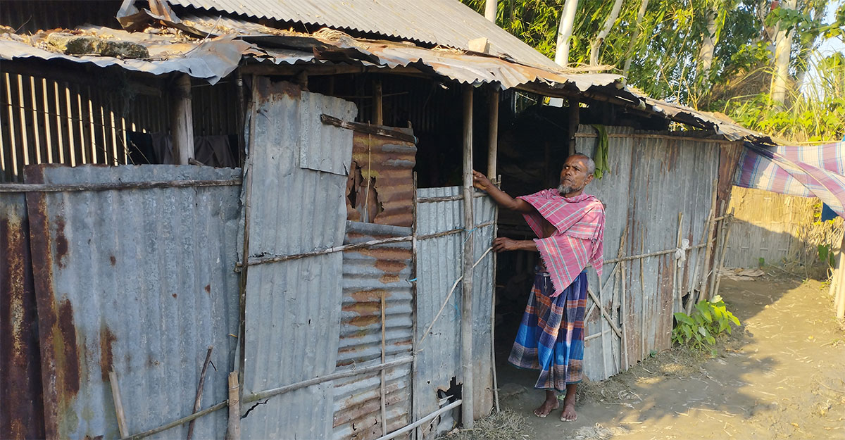 ‘দুই মাস থাকি বান (বন্যা)। কাজ-কামাই নাই। নিজের জায়গা-জমিন নাই। মানষের জায়গাত বাড়ি করি আছি। হামার বউ মানষের বাড়িত কাজ করে। তাহে দিয়া কোনোরকম চলছি। হাতোত কোন টেহা (টাকা) পয়সা নাই। ঈদোত যে এক পোয়া বয়লারের (ব্রয়লার) গোস্ত কিনমো, তারও ব্যবস্থা নাই।’