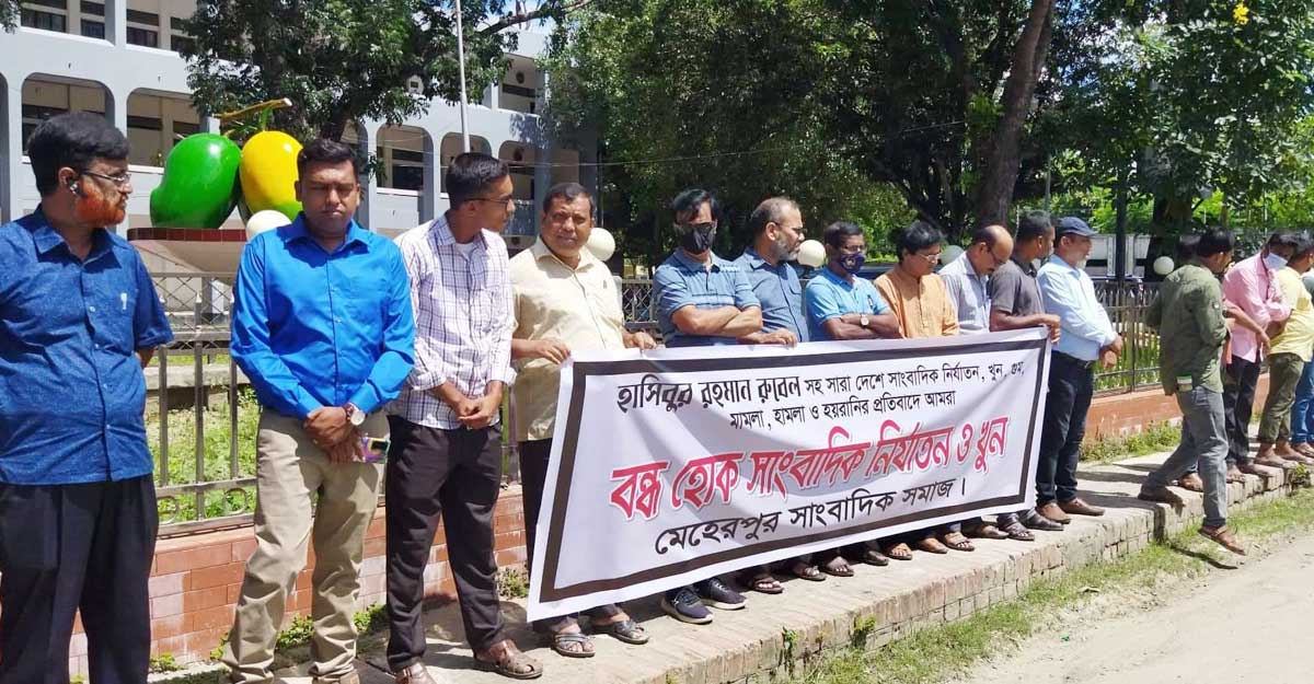 কুষ্টিয়ায় সাংবাদিক হাসিবুর রহমান রুবেল হত্যাসহ সারা দেশে সাংবাদিক নির্যাতন, গুম, খুন ও হত্যার প্রতিবাদ ও জড়িতদের গ্রেপ্তারের দাবিতে মেহেরপুরে মানববন্ধন করা হয়েছে। পরে জেলা প্রশাসকের কাছে স্মারকলিপি প্রদান করা হয়।
