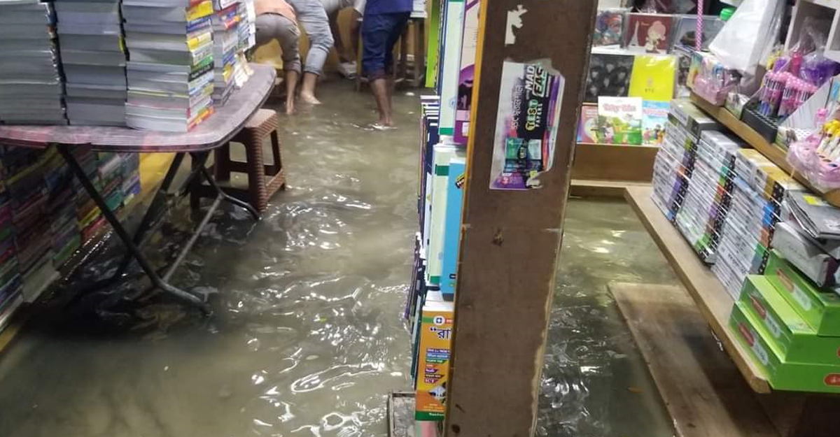 সিলেট নগরীর জিন্দা-বাজারের বই মার্কেট হিসেবে পরিচিত রাজা ম্যানশনে মুহূর্তেই হাঁটু-পানি উঠে যায়। এতে বেশ কয়েকটি দোকানের কয়েক লাখ টাকার বই পানিতে তলিয়ে যায়।