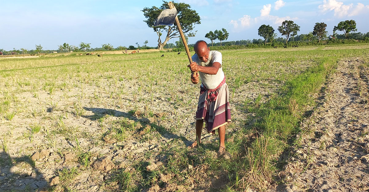 জয়পুরহাট জেলার সদর উপজেলার বম্বু ইউনিয়ন কড়ই মাঠে কথা হয় ৬৫ বছর বয়সী তোফাজ্জলের সঙ্গে। বৃষ্টির আশায় জমির আইলের পাশে মাটি সরিয়ে নিচ্ছিলেন তিনি।