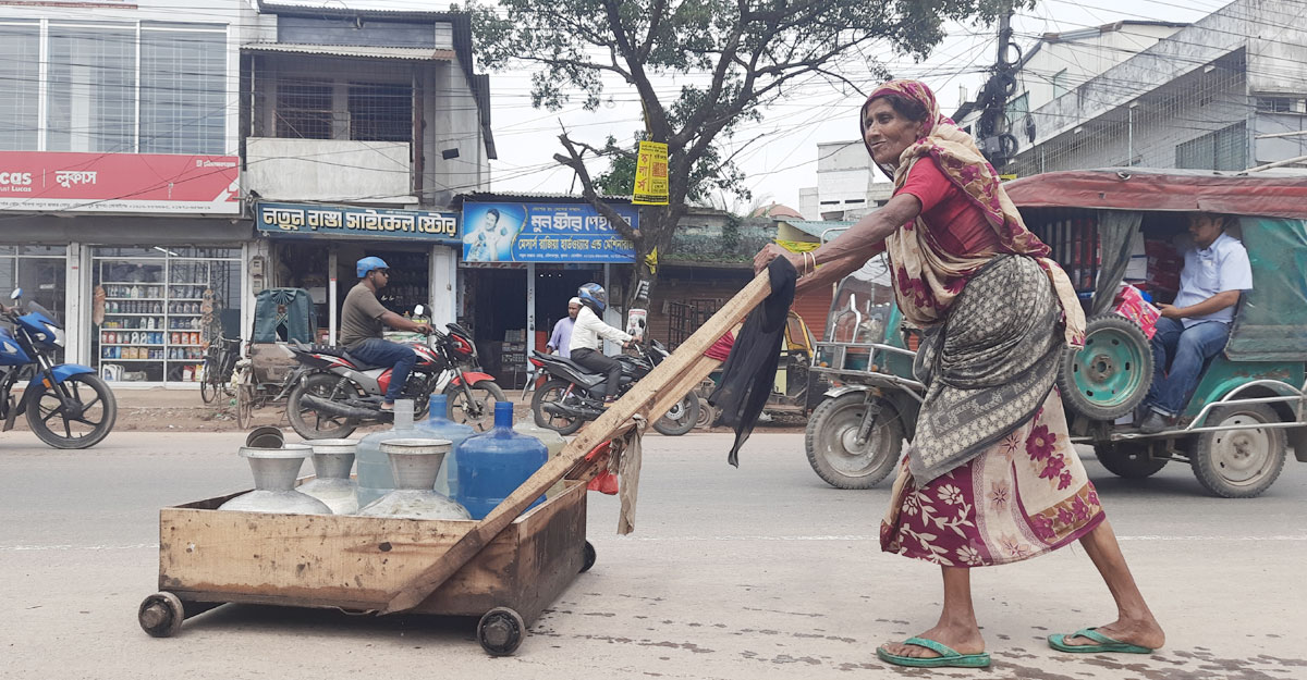 চোখে ঝাপসা দেখেন বৃদ্ধা আমেনা, তবুও ঝুঁকি নিয়ে পানি দেন হোটেলে