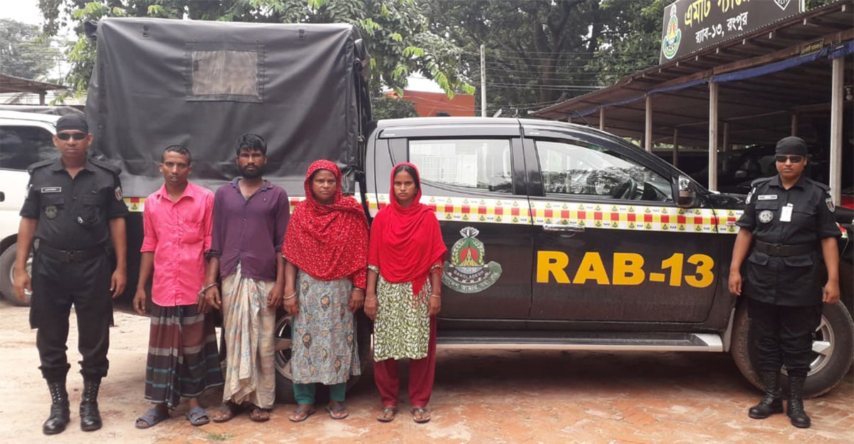 গ্রেপ্তার ব্যক্তিরা হলেন শের আলী ওরফে হানিফ (২২), ফকির উদ্দিন (২৭), সুরিতা বেগম (৪৮) ও মালেকা বেগম (২২)। তারা সবাই জেলার জলঢাকা উপজেলার বাসিন্দা।
