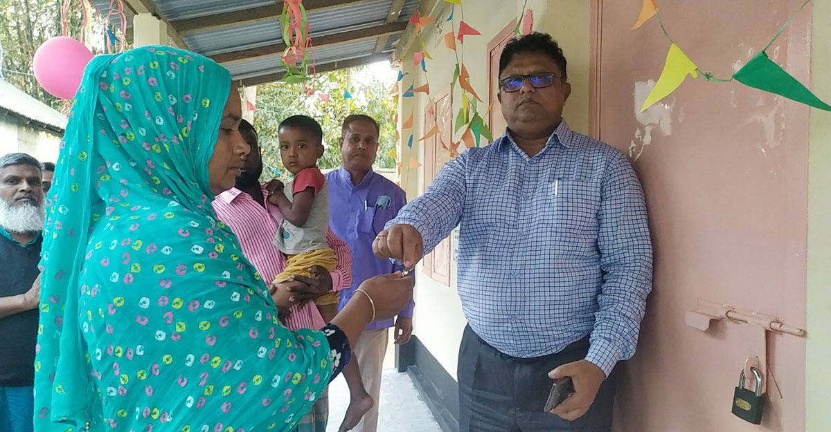 ফুল বাবুর পরিবারকে বাড়ি হস্তান্তর করছেন কুড়িগ্রাম-লালমনিরহাট পল্লী বিদ্যুৎ সমিতির সাধারণ ব্যবস্থাপক স্বদেশ কুমার ঘোষ