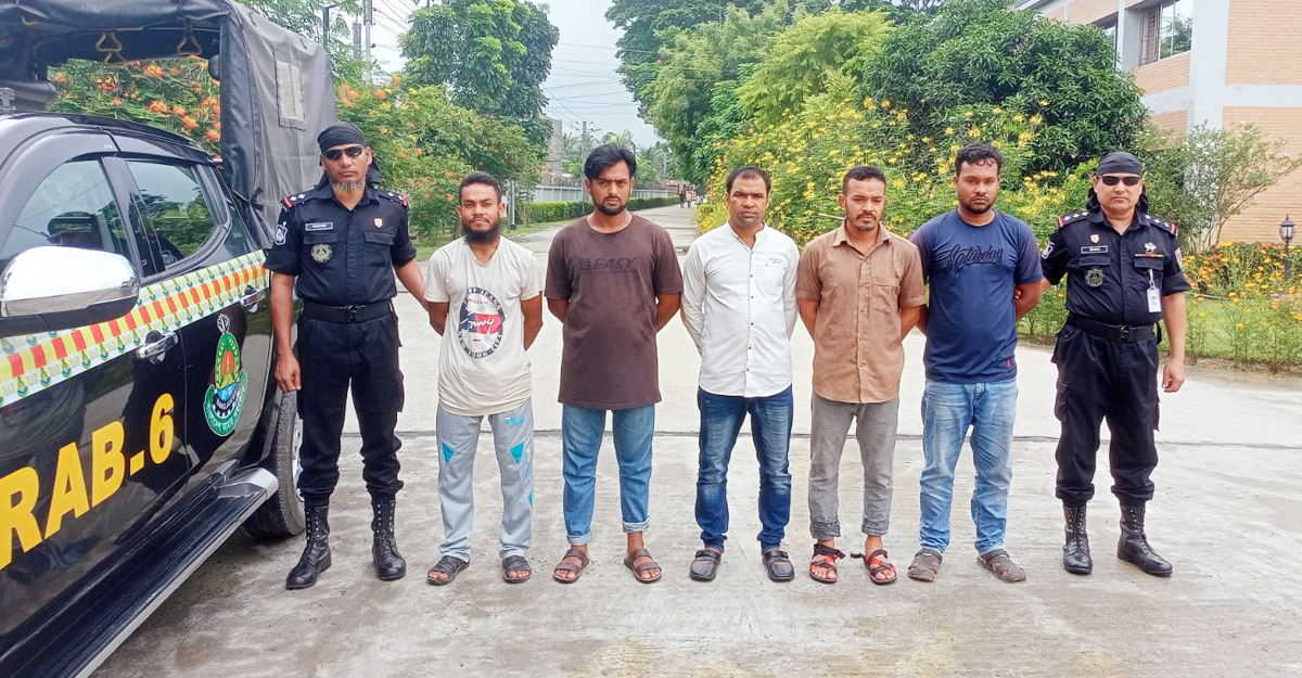 গ্রেপ্তাররা হলেন গোপালগঞ্জ তেবাড়িয়ার মৃত ফিরোজ আলী শেখের ছেলে রাজু শেখ (২৫), নড়াইল নড়াগাতির মো. হাবিবুর রহমান মোল্লার ছেলে সাইফুল ইসলাম মোল্লা (৩০), একই জেলার পহরডাঙ্গা এলাকার মো. শহিদুল ইসলামের ছেলে মো. হোজাইফা আল বারী (২৮), খুলনা দৌলতপুর আঞ্জুমান রোডের মৃত মোতালেব বেগের ছেলে মো. রানা বেগ (৩০) ও খুলনার লবণচরা নিজ খামার এলাকার মো. আবু দাউদ মৌলঙ্গীর ছেলে মো. রাসেল মৌলঙ্গী (২৮)।