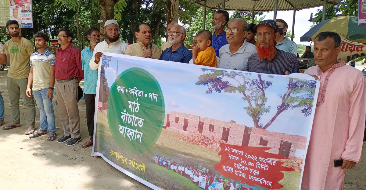 শুক্রবার (১২ আগস্ট) দুপুরে ময়মনসিংহ সার্কিট হাউস মাঠ সংলগ্ন ব্যাট-বল চত্বরে আয়োজিত বলাইশিমুল মাঠপ্রেমির ব্যানারে কথা-কবিতা-গানে মাঠ রক্ষার এ আহ্বান জানানো হয়।