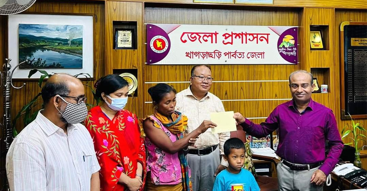 অভাবের তাড়নায় একমাত্র ছেলেকে হাটে বিক্রি করতে নিয়ে যাওয়া মা সোনালি চাকমাকে সঞ্চয়পত্র করার জন্য এক লাখ টাকার চেক তুলে দিয়েছেন খাগড়াছড়ির জেলা প্রশাসক প্রতাপ চন্দ্র বিশ্বাস।