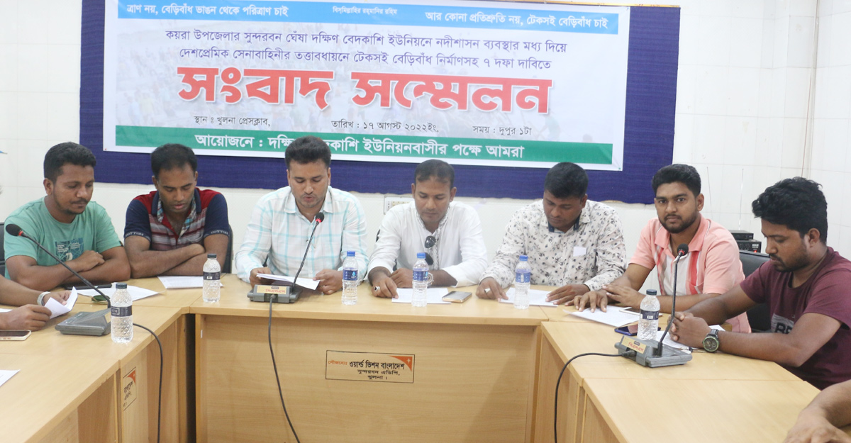 খুলনার কয়রা উপজেলার দক্ষিণবেদকাশি ইউনিয়নে নদীশাসন ব্যবস্থার মধ্য দিয়ে সেনাবাহিনীর তত্ত্বাবধায়নে টেকসই বেড়িবাঁধ নির্মাণসহ ৭ দফা দাবি জানানো হয়েছে। বুধবার (১৭ আগস্ট) দুপুরে খুলনা প্রেস ক্লাবে এক সংবাদ সম্মেলনে এসব দাবি জানানো হয়।