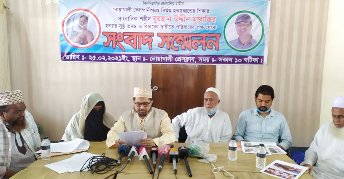 নোয়াখালীর কোম্পানীগঞ্জে আওয়ামী লীগের দুই পক্ষের সংঘর্ষের সংবাদ সংগ্রহের সময় গুলিতে নিহত সাংবাদিক বুরহান উদ্দিন মুজাক্কিরের হত্যাকারীদের সুষ্ঠু বিচার দাবি করেছেন পরিবারের সদস্যরা। বৃহস্পতিবার (২৫ ফেব্রুয়ারি) সকাল ১০টার দিকে নোয়াখালী প্রেসক্লাবে সংবাদ সম্মেলন করে তারা এ দাবি জানান।