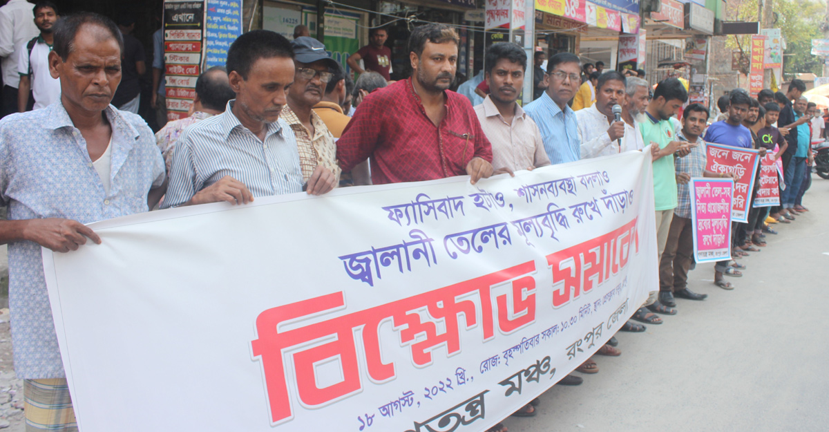 বৃহস্পতিবার (১৮ আগস্ট) দুপুরে রংপুর প্রেস ক্লাব চত্বরে অনুষ্ঠিত বিক্ষোভ সমাবেশে এ অভিযোগ তুলে ধরে ক্ষমতাসীন সরকারের পদত্যাগ দাবি করেন গণতন্ত্র মঞ্চ। জ্বালানি তেলের মূল্য বৃদ্ধির প্রতিবাদ ও সংবিধান সংস্কারসহ বিভিন্ন দাবিতে বিক্ষোভ মিছিল সমাবেশের আয়োজন করে গণতন্ত্র মঞ্চ নামের নতুন এই রাজনৈতিক জোট।