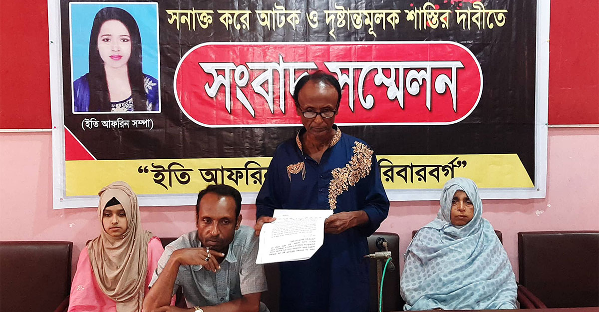 সংবাদ সম্মেলনে নিহত ইতি আফরিন সম্পার মা লাভলী ইয়াসমিন সেফালী, বড় ভাই সাইফুল ইসলাম এবং ভাগ্নি অনন্যা ইয়াসমিন বৃষ্টি উপস্থিত ছিলেন।