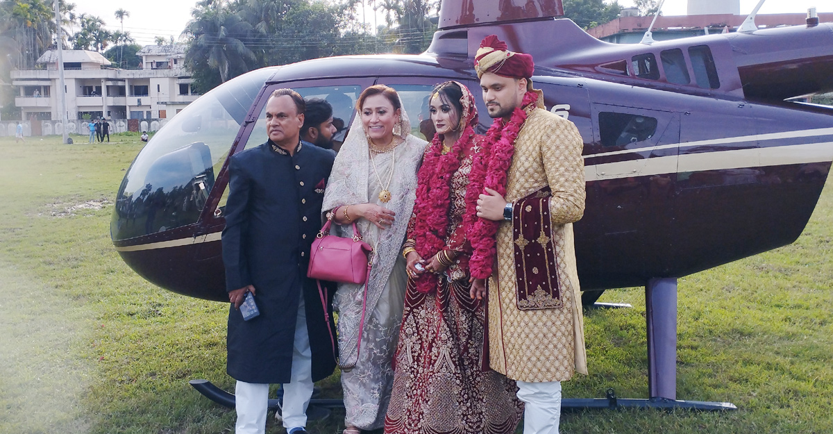 সোমবার (২৯ আগস্ট) দুপুরে মৌলভীবাজার সরকারি উচ্চ বিদ্যালয় মাঠ থেকে কনেকে আনতে হেলিকপ্টারে সিলেটের কুশিয়ারা আন্তর্জাতিক কনভেনশন হলে বরযাত্রী যান বর ডা. ফারজাহান জহির চৌধুরী। বিকেলে কনে ডা. মেহজাবিন রশিদ নুহাকে নিয়ে একই মাঠে অবতরণ করেন তিনি।