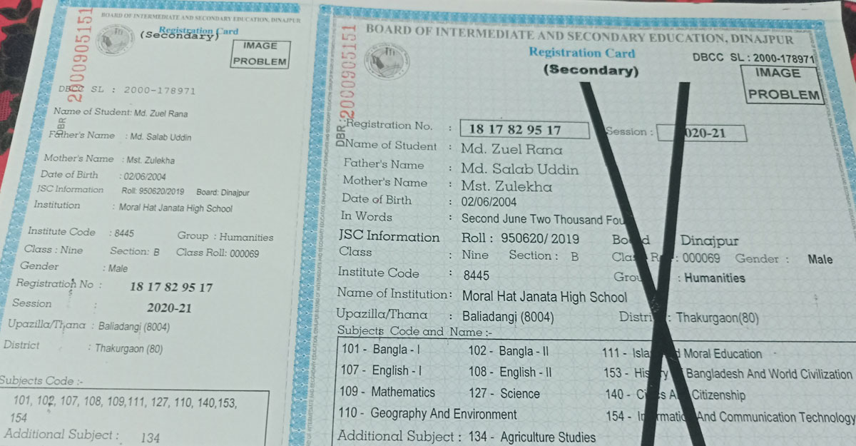 ঠাকুরগাঁওয়ের বালিয়াডাঙ্গী উপজেলার বড় পলাশবাড়ী ইউনিয়নের মোড়লহাট জনতা উচ্চ বিদ্যালয়ের ২০২২ সালের এসএসসি পরীক্ষার্থীদের রেজিস্ট্রেশন কার্ডে ভুল হয়েছে। শিক্ষাপ্রতিষ্ঠান ও বোর্ডের ভুলের মাশুল গুনতে হচ্ছে পরীক্ষার্থীদের। আর তা সংশোধন করার জন্য প্রত্যেকের কাছে ফি নেওয়া হচ্ছে। টাকা না দিলে রেজিস্ট্রেশন কার্ড পাওয়া যাচ্ছে না বলে অভিযোগ শিক্ষার্থীদের।