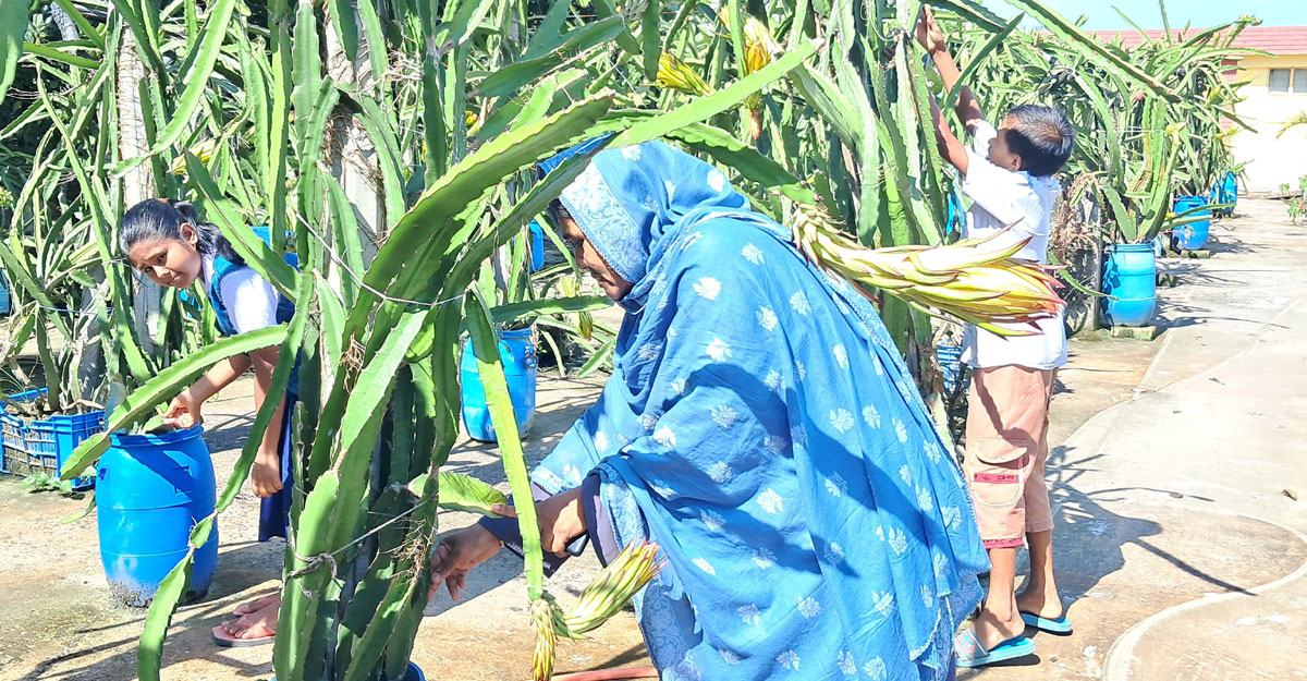 আঁকাবাঁকা সিঁড়ি বেয়ে ছাদে ওঠতেই দেখা মিলল নজরকাড়া বাগান। আরেকটু সামনে গিয়ে দেখা মিলল গাছে ঝুলে থাকা ছোট-বড় ড্রাগন ফল। যেন ড্রাগনের ভারে নুয়ে পড়ছে প্রতিটি গাছ। শুরুতে দেখে যে কারোরই মনে হবে এটি একটি বাণিজ্যিকভাবে গড়ে তোলা ড্রাগন বাগান। কিন্তু না, এটি একটি প্রাথমিক স্কুলের ছাদ বাগান।