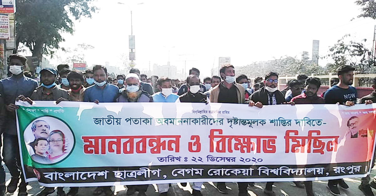বেরোবি উপাচার্য ড. নাজমুল আহসান কলিমউল্লাহর পদত্যাগসহ পতাকা বিকৃতির ঘটনায় জড়িত শিক্ষকদের বহিষ্কার দাবিতে ছাত্রলীগের মিছিল