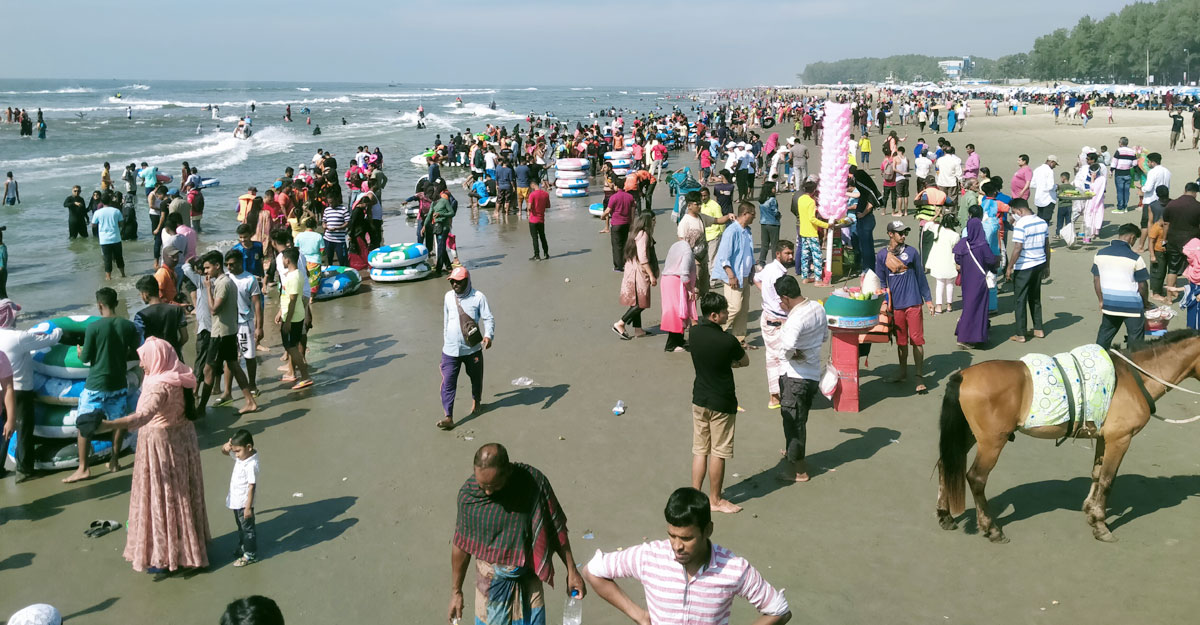 সনাতন ধর্মাবলম্বীদের প্রতিমা বিসর্জন, সাপ্তাহিক ছুটি এবং ঈদে মিলাদুন্নবী মিলে টানা ৫ দিনের ছুটিতে বিশ্বের দীর্ঘতম সমুদ্র সৈকত কক্সবাজারে লাখো মানুষের ঢল নেমেছে।