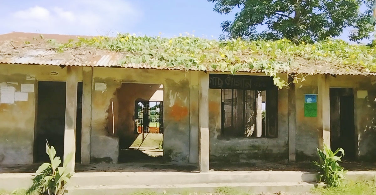 আশ্রয়ণ প্রকল্পের জরাজীর্ণ ঘর, পলিথিন দিয়ে বৃষ্টি ঠেকানোর চেষ্টা