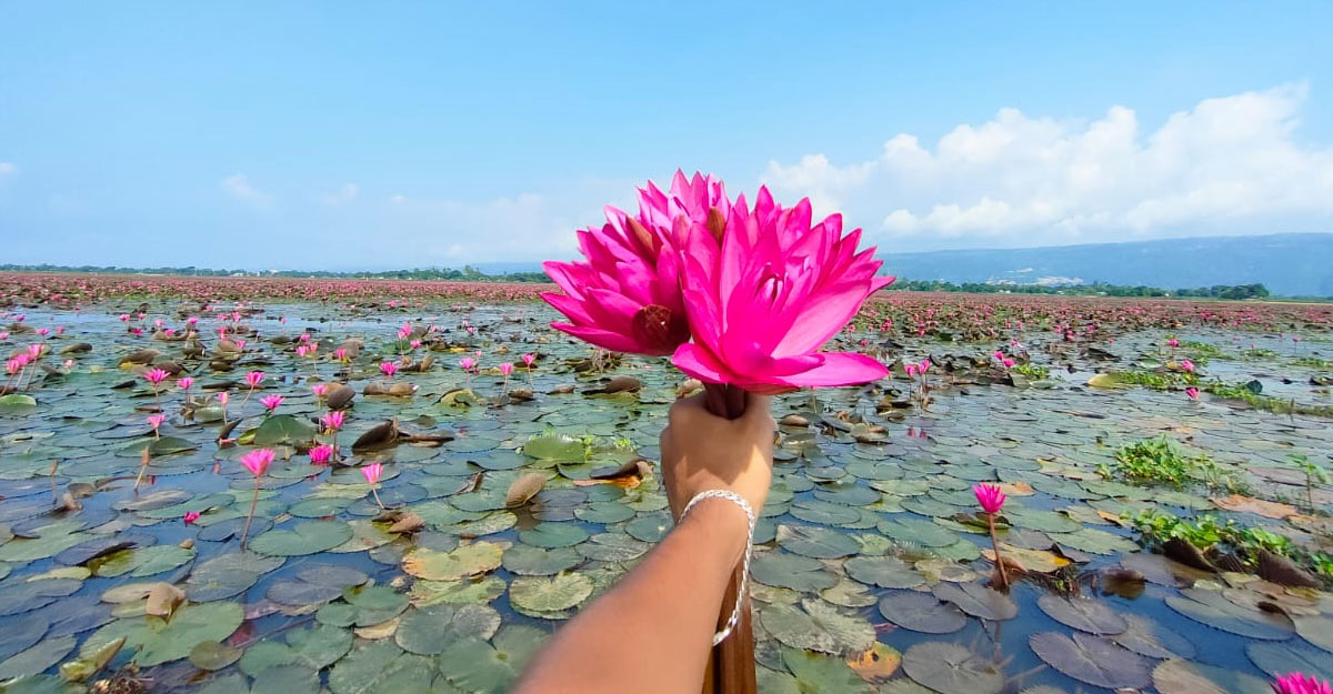 পাহাড়ের নিচে মুগ্ধতা ছড়াচ্ছে লাল শাপলা