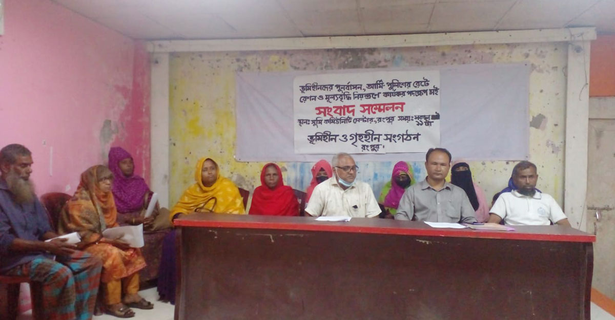 রোববার (১৬ অক্টোবর) দুপুরে রংপুর নগরীর একটি কমিউনিটি সেন্টারে অনুষ্ঠিত সংবাদ সম্মলন থেকে অকৃষি খাসজমির বরাদ্দ বাতিল করে ভূমিহীন ও গৃহহীনদের পুনর্বাসনের দাবিসহ নিত্যপ্রয়োজনীয় জিনিসের দাম কমানো, প্রত্যেক নিম্নআয়ের দরিদ্র পরিবারকে রেশনিংয়ের আওতায় এনে আর্মি ও পুলিশের রেটে রেশন দেওয়ার দাবি জানিয়েছে ভূমিহীন ও গৃহহীন সংগঠন।