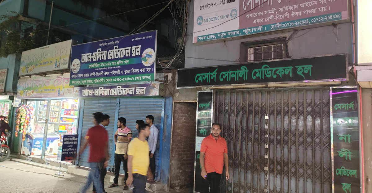 পটুয়াখালী ড্রাগ অ্যান্ড ক্যামিস্ট মালিক সমিতির সভাপতি মো. রাহাত হোসেন এবং পটুয়াখালী মেডিকেল হল মালিক মো. জাহাঙ্গীর হোসেন দাবি করেন, ভ্রাম্যমাণ আদালত পরিচালনা করে নির্বাহী ম্যাজিস্ট্রেট ডিলিং লাইসেন্স নামে এক ধরনের লাইসেন্স দেখতে চান। দেখাতে না পারায় লাজ ফার্মা ফার্মেসিকে ১৫ হাজার টাকা ও পটুয়াখালী মেডিকেল হল ফার্মেসিকে ১০ হাজার টাকা জরিমানা করা হয়। এতে পটুয়াখালী শহরের সকল ওষুধের দোকান অনির্দিষ্টকালের জন্য বন্ধ ঘোষণা করেন ওষুধ ব্যবসায়ীরা।