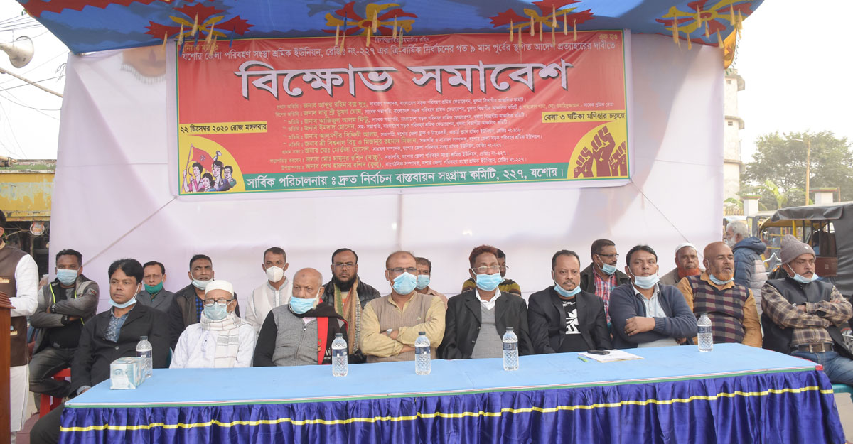 মঙ্গলবার (২২ ডিসেম্বর) বিকেলে শহরের মণিহার চত্বরে আয়োজিত বিক্ষোভ সমাবেশে এই ঘোষণা দেওয়া হয়। যশোর জেলা পরিবহন সংস্থা শ্রমিক সমিতির নির্বাচন বাস্তবায়ন সংগ্রাম কমিটি এই বিক্ষোভ সমাবেশের আয়োজন করে।