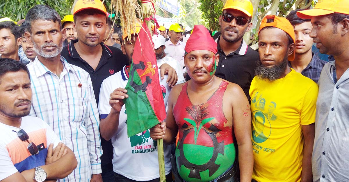 গায়ে বিএনপির পতাকা এঁকে সমাবেশে উজিরপুরের চুন্নু