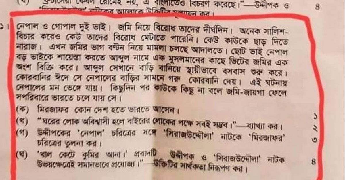 প্রশ্নের উদ্দীপক অংশে বলা হয়, ‘নেপাল ও গোপাল দুই ভাই। জমি নিয়ে বিরোধ তাদের দীর্ঘদিন। অনেক সালিশ-বিচার করেও কেউ তাদের বিরোধ মেটাতে পারেনি। কেউ কাউকে ছাড় দিতে নারাজ। এখন জমির ভাগ-বণ্টন নিয়ে মামলা চলছে আদালতে। ছোট ভাই নেপাল বড় ভাইকে শায়েস্তা করতে আব্দুল নামে এক মুসলমানের কাছে ভিটের জমির এক অংশ বিক্রি করে। আব্দুল সেখানে বাড়ি বানিয়ে স্থায়ীভাবে বসবাস শুরু করে। কোরবানির ঈদে সে নেপালের বাড়ির সামনে গরু কোরবানি দেয়। এই ঘটনায় নেপালের মন ভেঙে যায়। কিছুদিন পর কাউকে কিছু না বলে জমি-জায়গা ফেলে সপরিবারে ভারতে চলে যায় সে।’