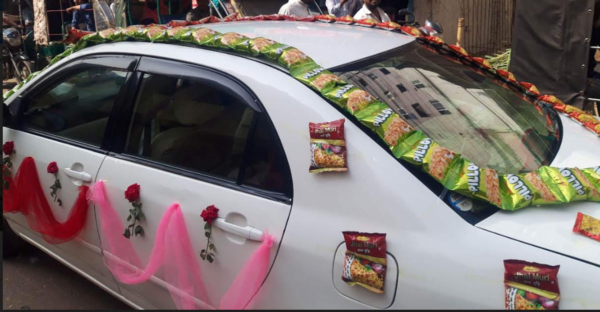 চিপসের প্যাকেটে সাজানো হলো বরের গাড়ি