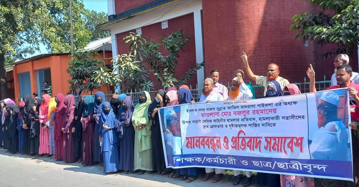 সিরাজগঞ্জের কামারখন্দ উপজেলার পাইকশার ইসলাম নগর দারুস সুন্নাত ফাজিল মাদ্রাসার অধ্যক্ষ মাওলানা বজলুর রহমানকে মারপিটের প্রতিবাদে মানববন্ধন ও বিক্ষোভ মিছিল করেছেন প্রতিষ্ঠানটির শিক্ষক-শিক্ষার্থী ও কর্মচারীরা। মঙ্গলবার (১৫ নভেম্বর) বেলা ১১টার দিকে মাদ্রাসার সামনের পাইকশা-সিরাজগঞ্জ আঞ্চলিক সড়কের পাশে মানববন্ধন অনুষ্ঠিত হয়।