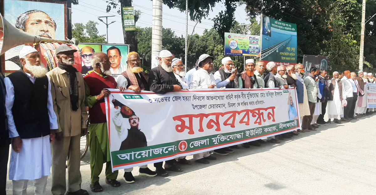 মঙ্গলবার (১৫ নভেম্বর) দুপুরে জেলা শহরের ডিসির মোড় বঙ্গবন্ধু ম্যুরাল চত্বরে এ মানববন্ধন অনুষ্ঠিত হয়। মানববন্ধন ও বিক্ষোভ মিছিলে নেতৃত্ব দেন ছয় উপজেলার মুক্তিযোদ্ধা সংসদের সাবেক কমান্ডাররা। শহরের আলিয়া মাদ্রাসার মোড় থেকে বিক্ষোভ মিছিলটি বের হয়ে প্রধান প্রধান সড়ক প্রদক্ষিণ শেষে ডিসির মোড় বঙ্গবন্ধু ম্যুরাল চত্বরে মিলিত হয়।