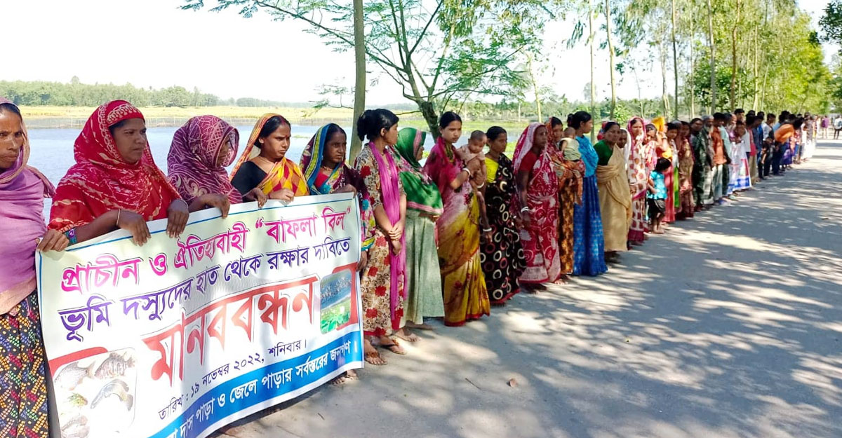 শনিবার (১৯ নভেম্বর) বিকেলে বাফলা বিল এলাকায় ঘণ্টাব্যাপী মানববন্ধনে দক্ষিণ বাফলা দাস পাড়া মৎসজীবী সমবায় সমিতি ও হলাইপাড়া মৎস্যজীবী সমবায় সমিতির সদস্যরা অংশগ্রহণ করেন। এ সময় চাঁদ কিশোর রায়, আব্দুর রহমান, আজাদ আলী, রথি কান্ত রায় প্রমুখ বক্তব্য দেন।