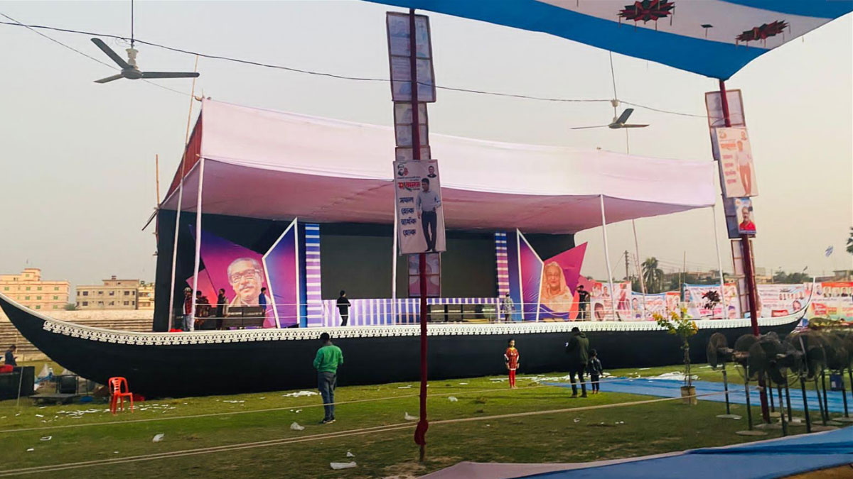 নোয়াখালীতে ১২০ ফুট দৈর্ঘ্যের নৌকার আদলে মঞ্চ তৈরি