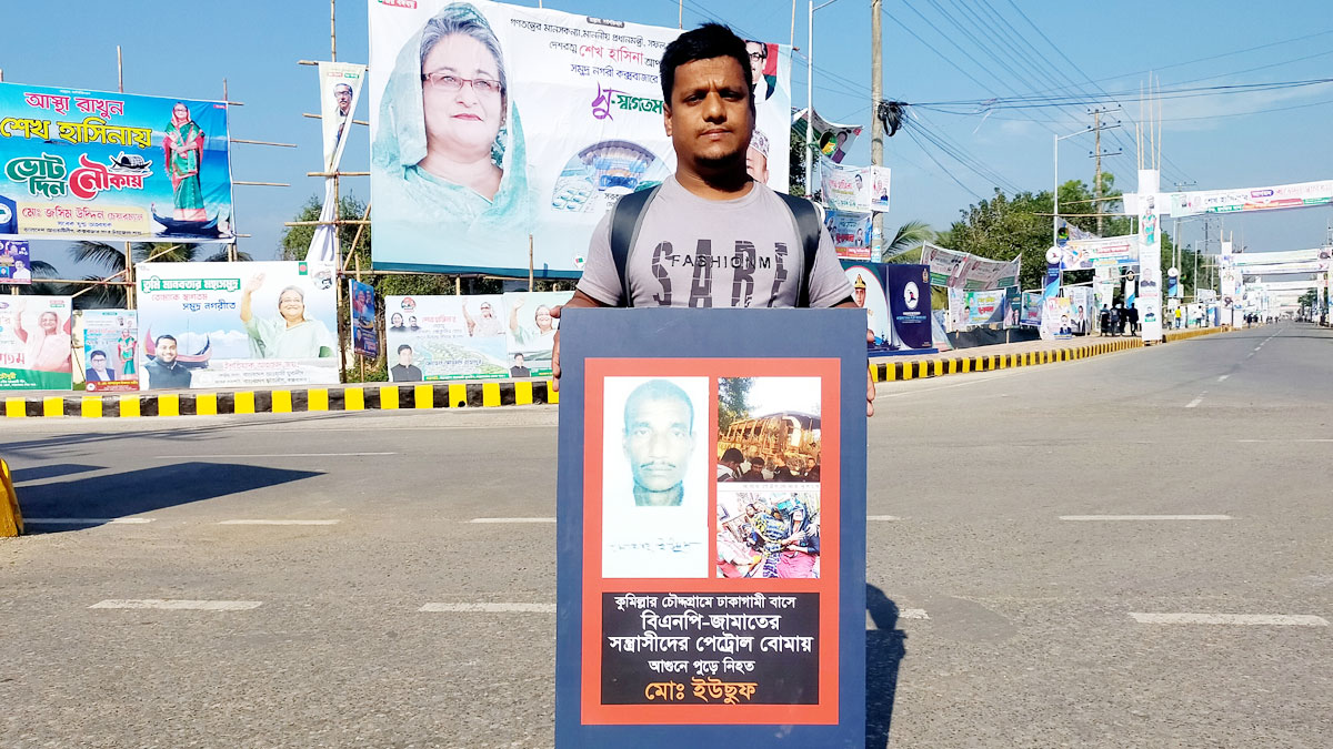 প্রধানমন্ত্রী শেখ হাসিনা যে শেখ কামাল আন্তর্জাতিক ক্রিকেট স্টেডিয়ামে ভাষণ দেবেন তার প্রধান ফটকে বাবার ছবি নিয়ে দাঁড়িয়ে আছেন জাহেদুল। জাহেদুল বলেন, ২০১৫ সালের ২ ফেব্রুয়ারি আমার বাবা কাতার যাওয়ার জন্য বাসে করে ঢাকা যাচ্ছিলেন। কুমিল্লার চৌদ্দগ্রাম পৌঁছালে বিএনপি-জামায়াতের নেতা-কর্মীরা গাড়িতে আগুন ধরিয়ে দেন। এতে ঘটনাস্থলে দগ্ধ হয়ে আমার বাবা মারা যান।