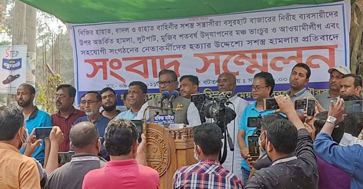 বসুরহাট পৌরসভা চত্বরে সংবাদ সম্মেলনে বক্তব্য রাখছেন কাদের মির্জা