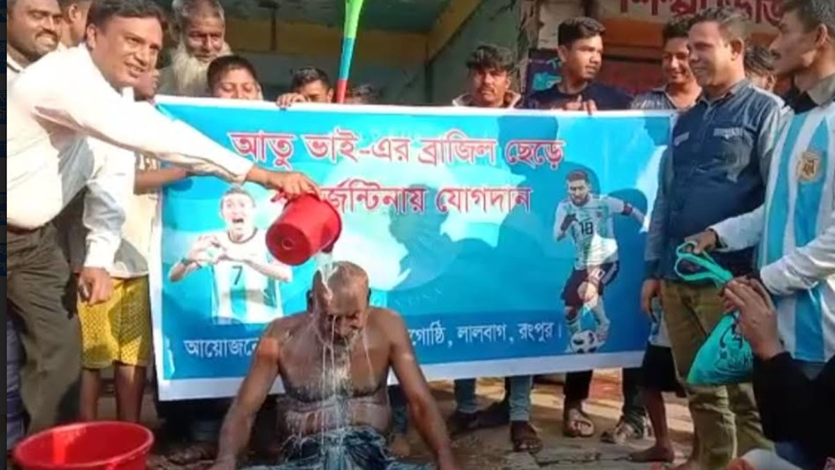 আর্জেন্টাইন দলপতি লিওনেল মেসির খেলায় মুগ্ধ হয়ে রংপুরে ব্রাজিলের এক সমর্থক নাম লিখিয়েছেন আর্জেন্টিনার সমর্থকদের সারিতে। দুধ দিয়ে গোসল করে ব্রাজিলের জার্সি খুলে গায়ে জড়িয়েছেন লিওনেল মেসির নাম্বার টেন জার্সি। ঘোষণা দিয়ে ব্রাজিল ছেড়ে আনুষ্ঠানিকভাবে যোগ দিয়েছেন আর্জেন্টিনায়। ফাইনালের দিনে ব্রাজিল সমর্থকের এমন কাণ্ডে আর্জেন্টিনার সমর্থকরা খুশি হলেও ক্ষুদ্ধ ব্রাজিল ভক্তরা।