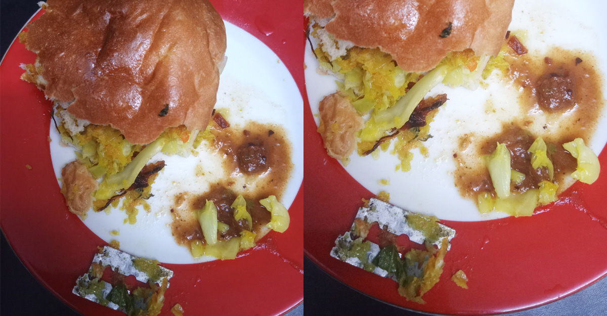 বিকেলের নাশতায় মজা করে খাচ্ছিলেন ভেজিটেবল বার্গার। মুখের মধ্যে শক্ত কিছু টের পেয়ে প্রথমে ভেবেছিলেন, ভেজিটেবল বার্গারে ভুল করে চিকেন বার্গারের কিছু দিয়েছে। কিন্তু পরের কামড়ে টের পেলেন আসলে চিকেন নয়; শক্ত কিছু। মুখ থেকে বার্গার বের করে দেখে চোখ ছানাবড়া। ভেজিটেবল বার্গারের ভেতর থেকে বেরিয়ে এল আস্ত ব্লেড।