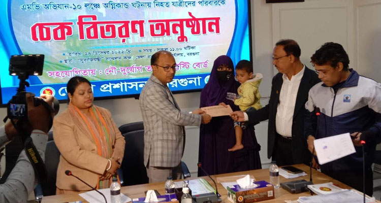 ঝালকাঠির সুগন্ধা নদীতে এমভি অভিযান- ১০ লঞ্চে অগ্নিকাণ্ড ঘটনায় নিহত যাত্রীদের পরিবারকে চেক বিতরণ করা হয়েছে। নিহত ১৪ জনের স্বজনদের দেড় লাখ টাকা করে মোট ২১ লাখ টাকার চেক হস্তান্তর করা হয়েছে।