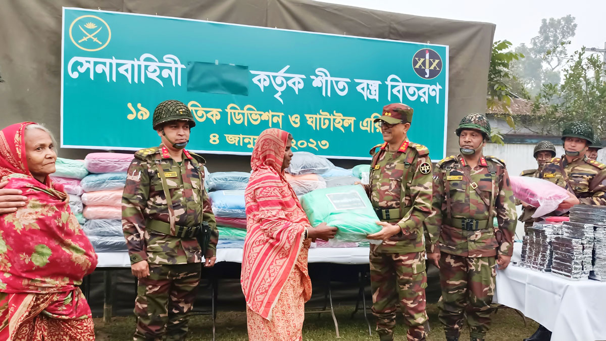 শীতকালীন প্রশিক্ষণে স্থানীয় অসহায় ও দুঃস্থ মানুষের মাঝে মানবিক কার্যক্রম পরিচালনা করছে বাংলাদেশ সেনাবাহিনী। বিনা মূল্যে চিকিৎসা সহায়তার পাশাপাশি বিতরণ করা হচ্ছে শীতবস্ত্রও।