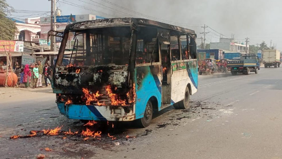 সিএনজির সঙ্গে সংঘর্ষের ঘটনায় বাসে আগুন