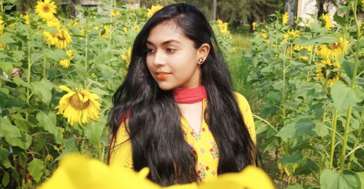 সূর্যমুখী বাগান দেখতে এসেছেন বিশ্ববিদ্যালয়ের শিক্ষার্থী প্রগতি বৈদ্য